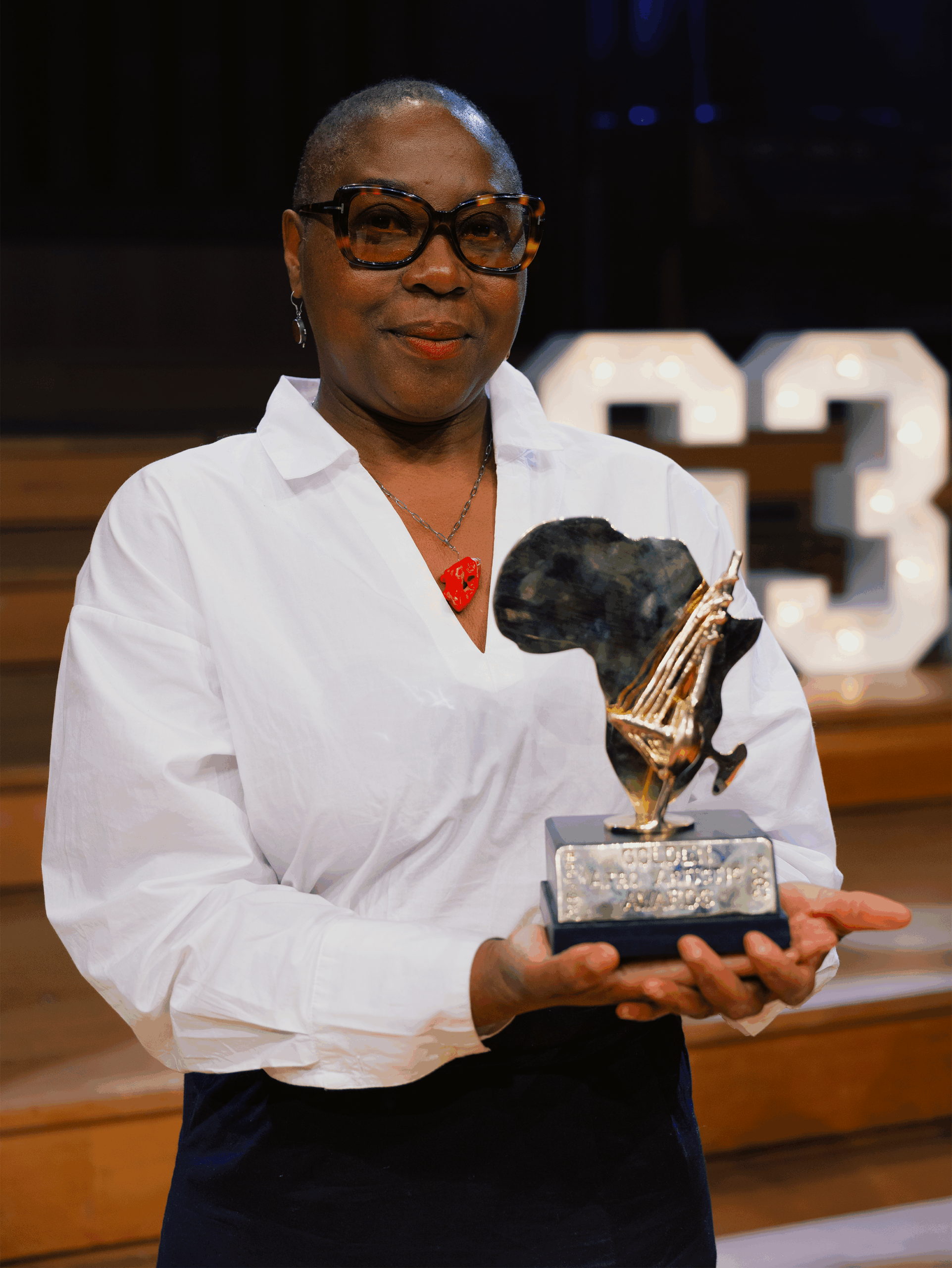 Pélagie Gbaguidi a remporté le Prix Arts plastiques. Surnommée la “griotte contemporaine”, elle donne vie aux blessures coloniales à travers son art, offrant des récits forts et émouvants qui font réfléchir et ressentir.